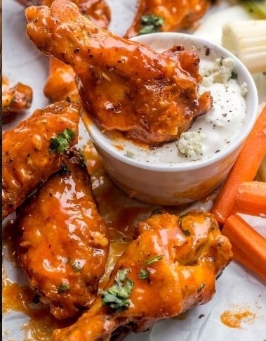 Tiras de pollo, tocino, aguacate, verdura, cebolla asada y mix de quesos, bañada en salsa buffalo con papas o ensalada