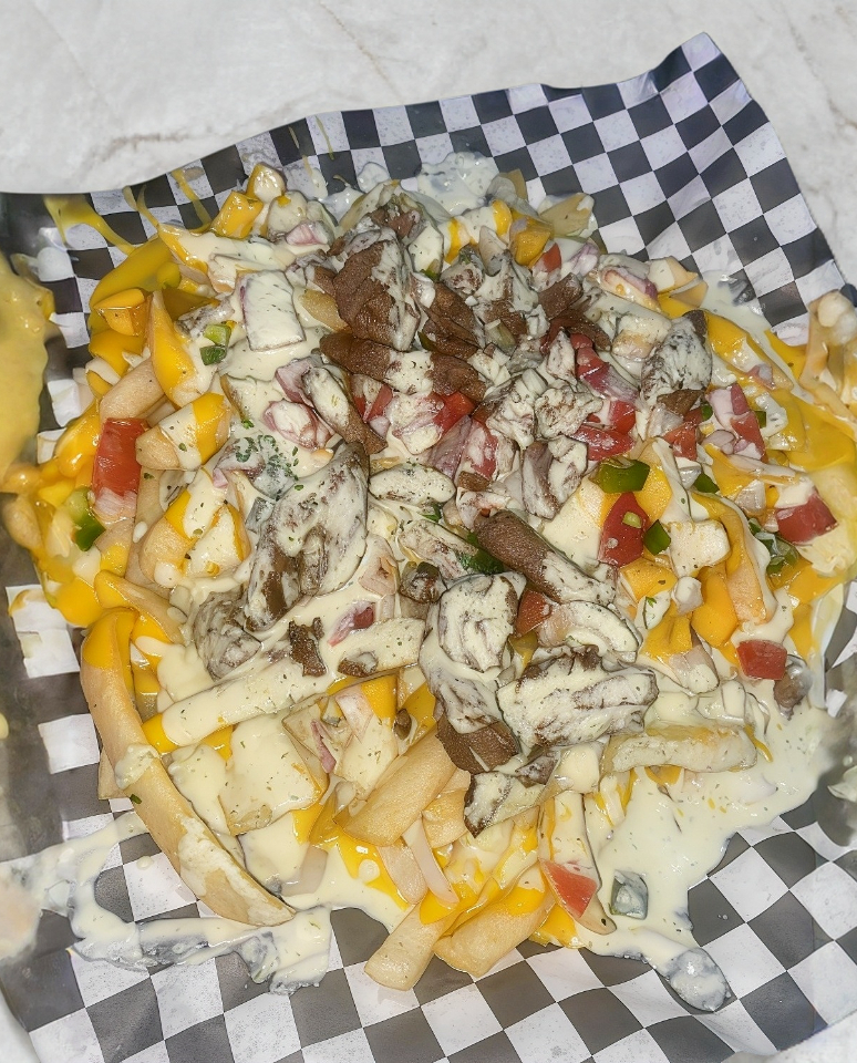 Con queso amarillo, queso blanco, pico de gallo, crema y arrachera asada.