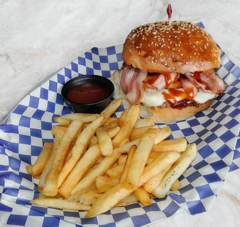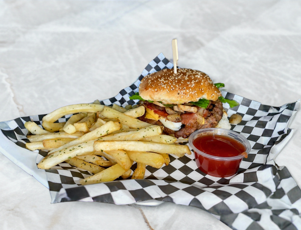 Doble carne, tocino, huevos estrellados, mix de quesos, lechuga, tomate y champiñones con papas o ensalada