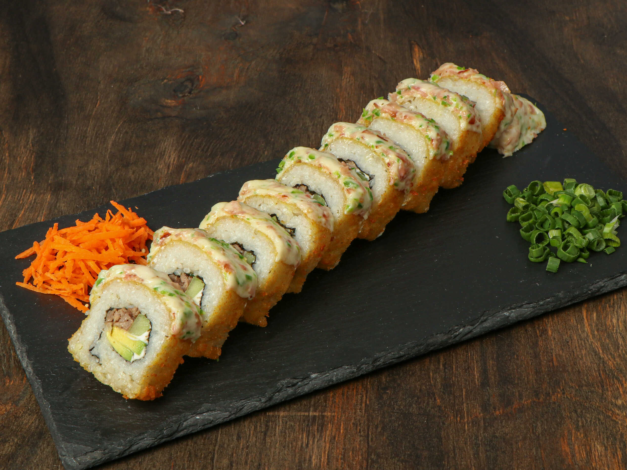 1 rollo de sushi de 11 pzs aprox. Empanizado por dentro pepino, aguacate, Philadelphia, carne de res y camarón, acompañado de salsa soya, aderezo, zanahoria, cebolla asada y chile serrano. (Porción personal)