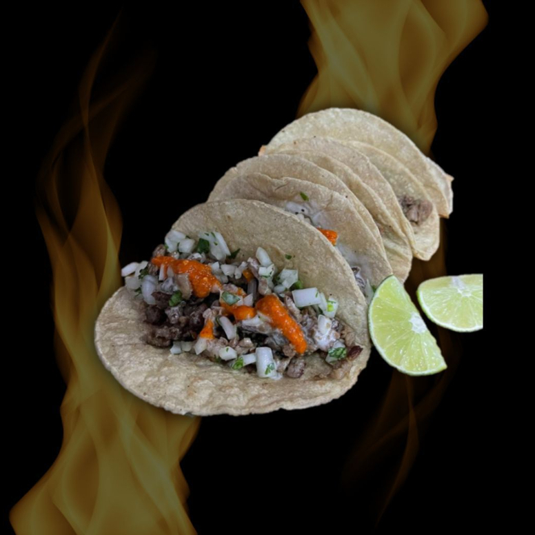 La tradición en tu paladar: Carne asada marinada y sazonada montada en tortilla de maíz suave, con aderezo de la casa y cebolla con cilantro.