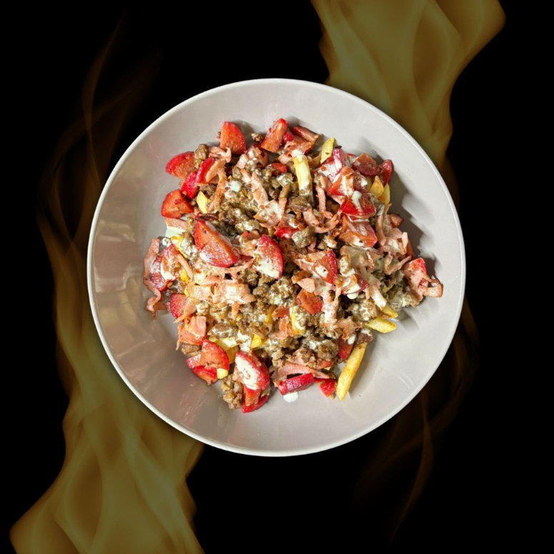 Papas a la francesa sazonadas, coronadas con jugosa carne asada, catsup, aderezo de la casa y el toque dulce de la cebolla asada.