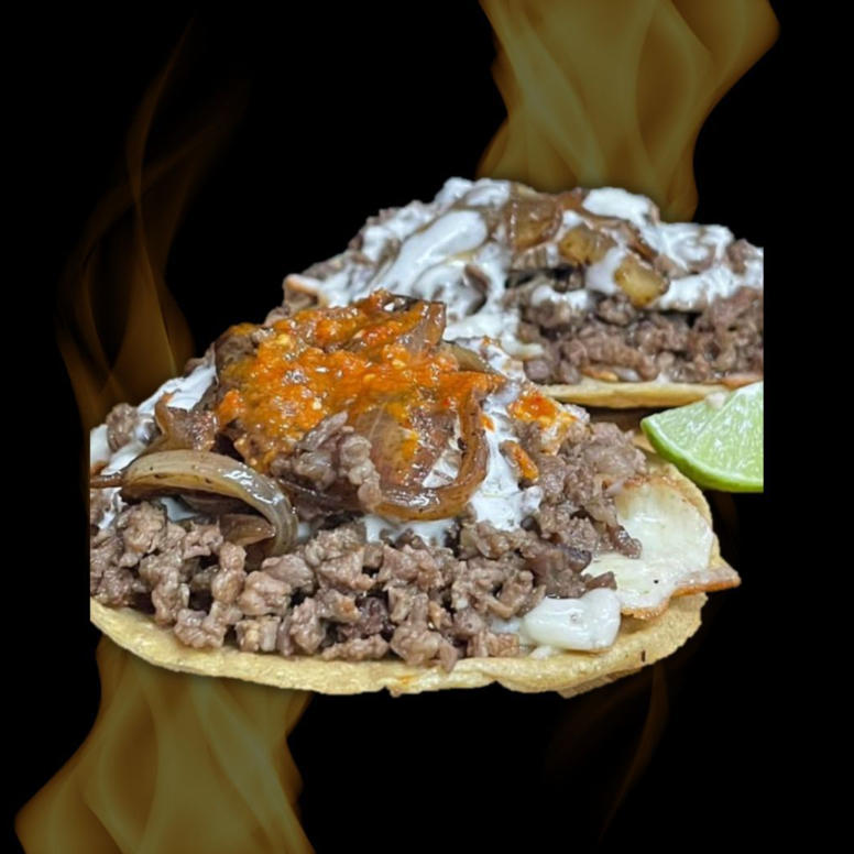 Especialidad única de carne asada marinada sobre una tortilla de maíz dorada con una costra de queso crujiente, cebolla asada y aderezo.