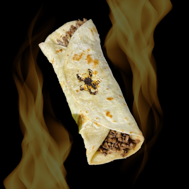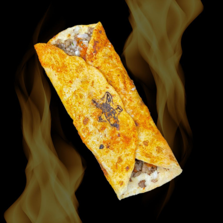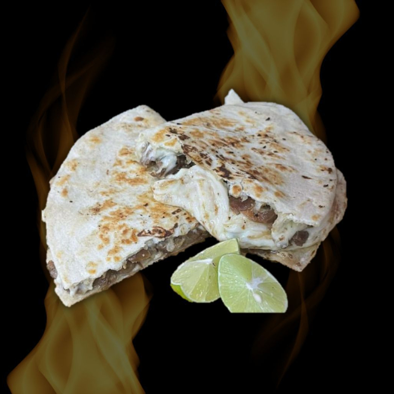 Una generosa tortilla de harina rellena de carne asada marinada y sazonada con queso derretido, acompañada de aderezo de la casa y cebolla con cilantro.