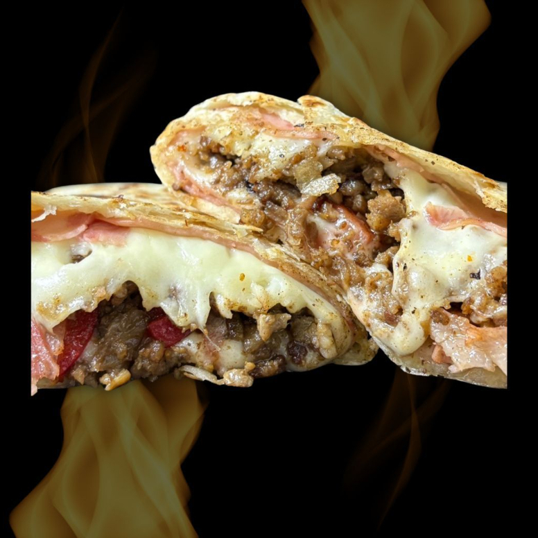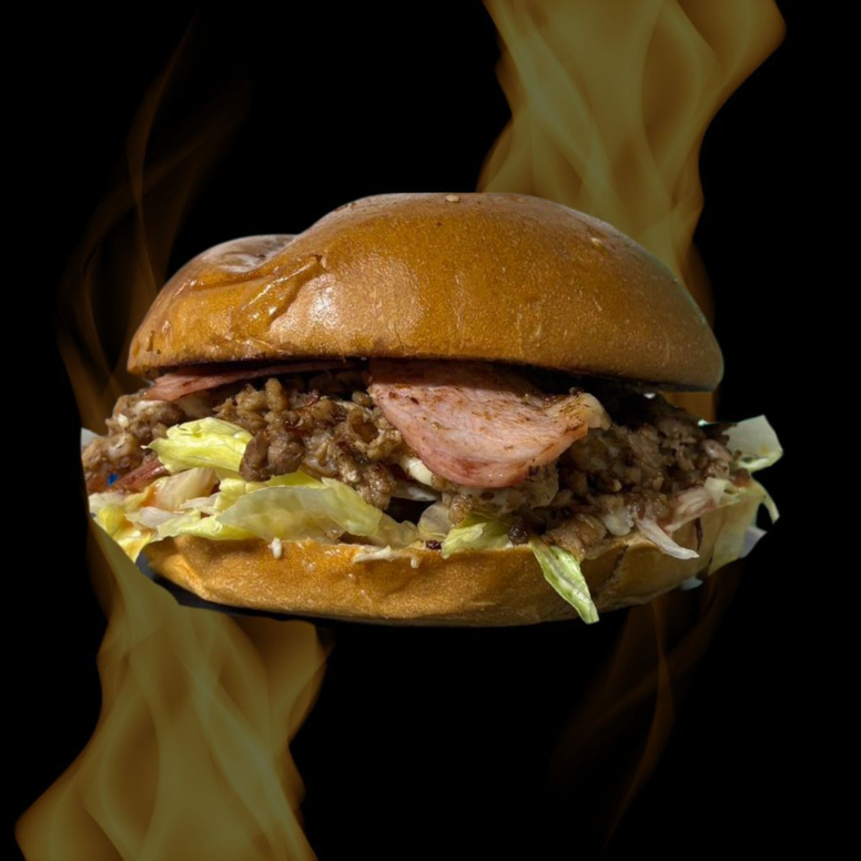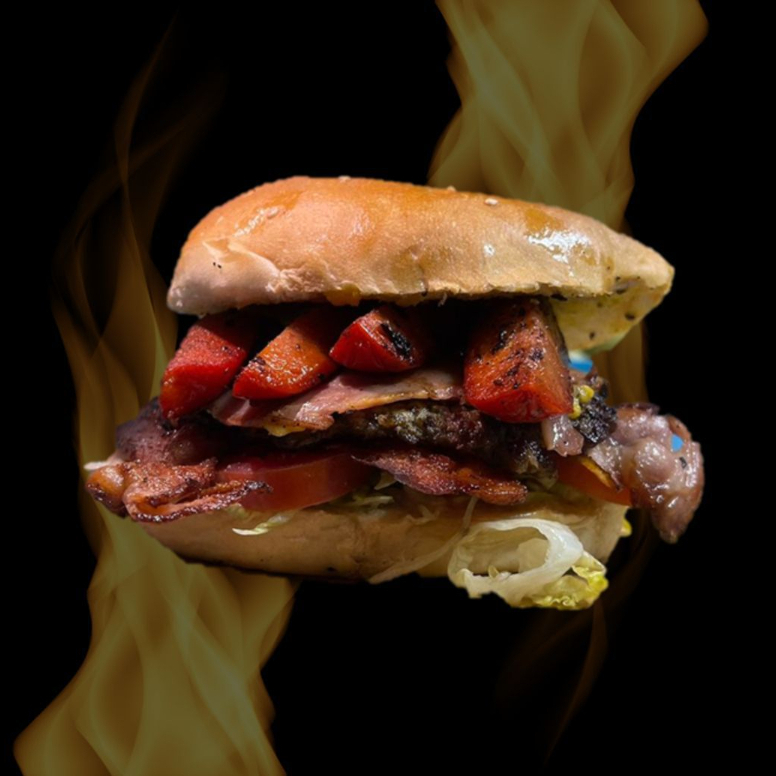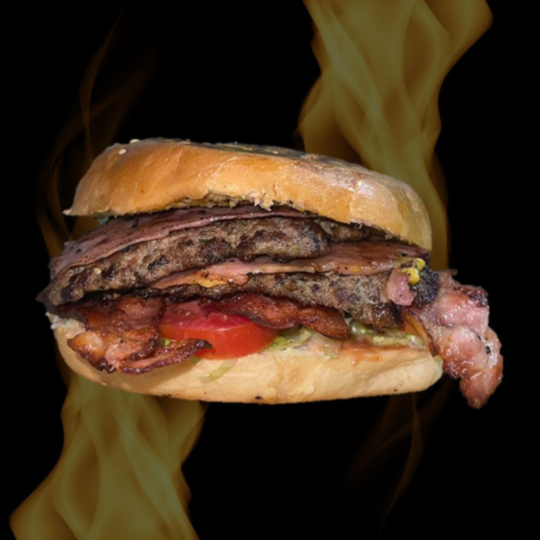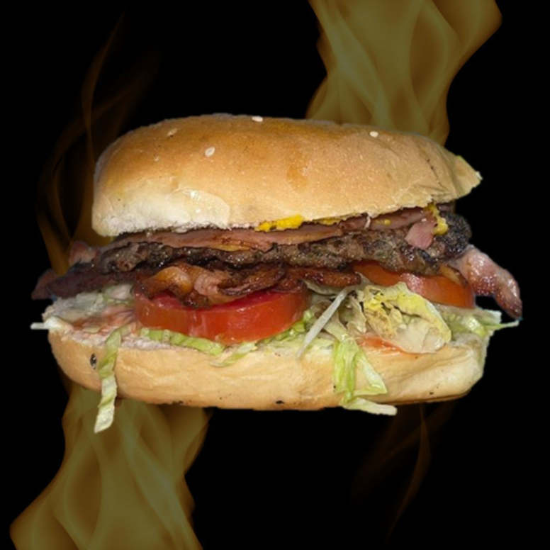 Doble proteína a tu elección (asada o carne de hamburguesa casera), doble jamón, queso, tocino, piña y una fresca selección de vegetales y aderezos.