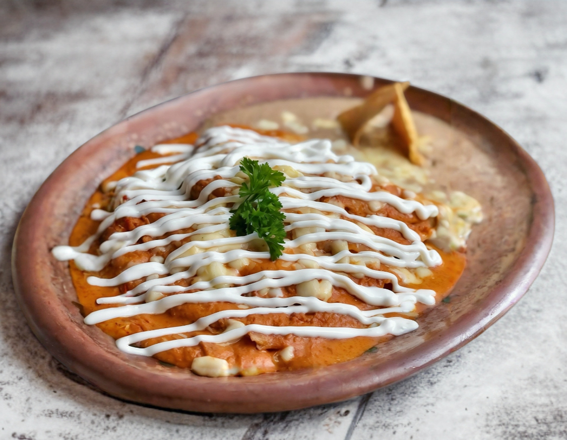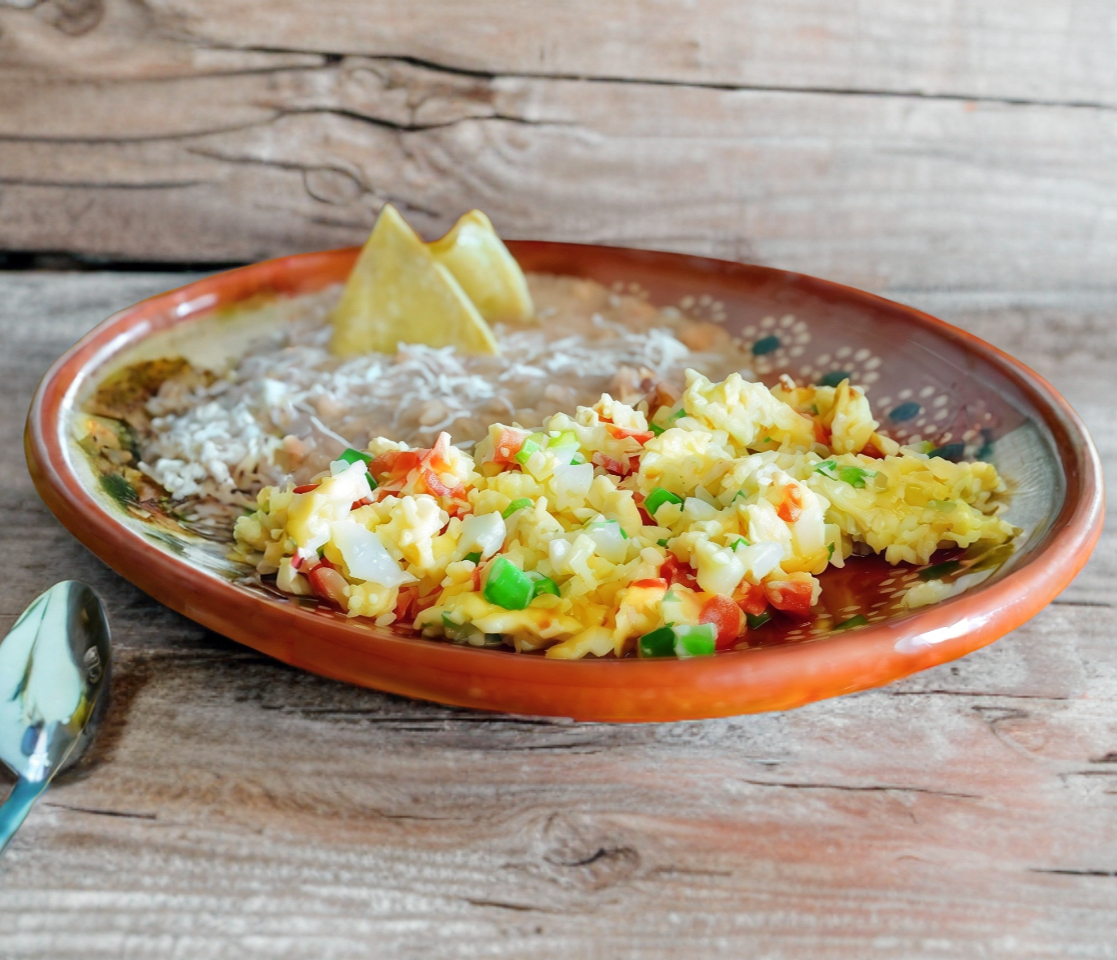 Ricos huevos en una cama de tortilla frita, bañados en salsa ranchera y acompañados de frijoles refritos con jamón o tocino.