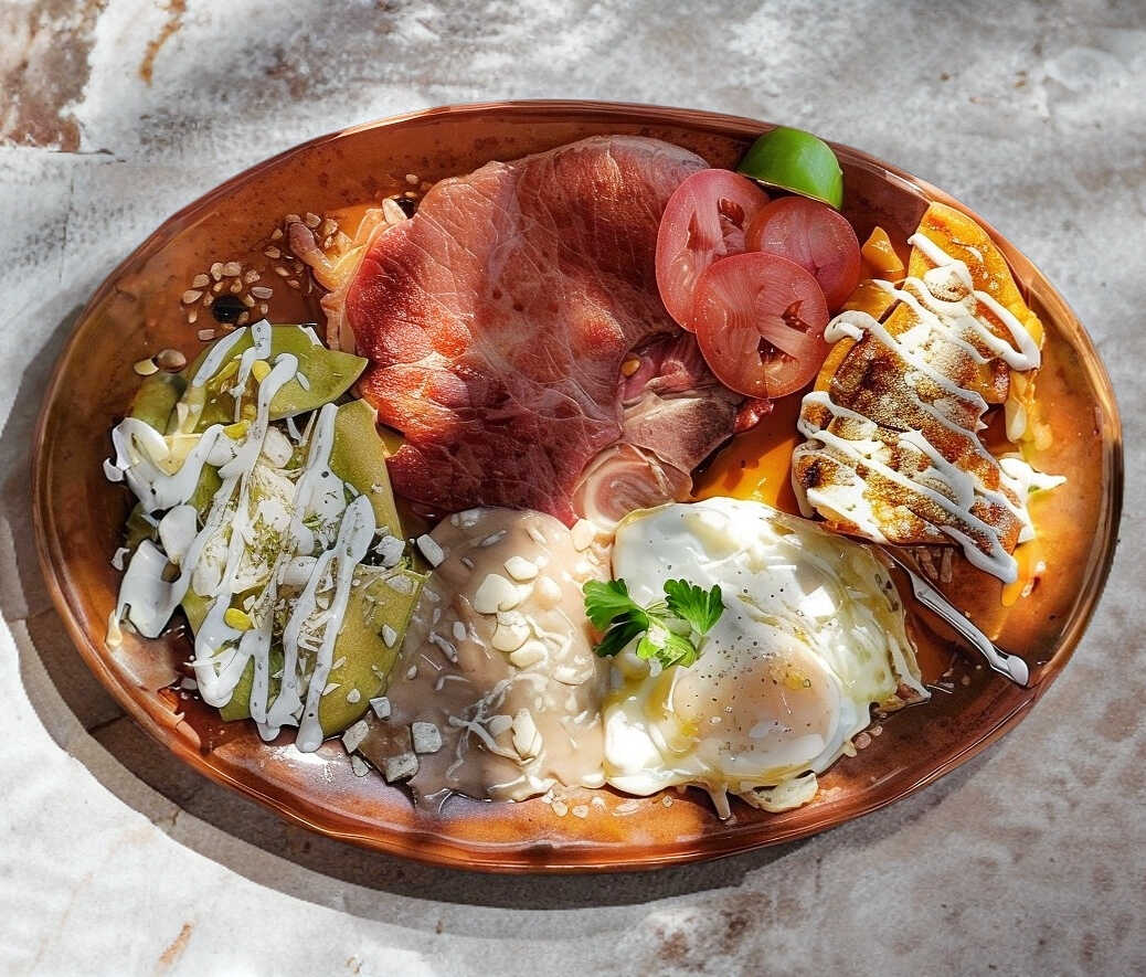 Rica chuleta ahumada y huevo al gusto chilaquiles rojos y verdes, frijoles refritos y rebanadas de tomate sazonado.