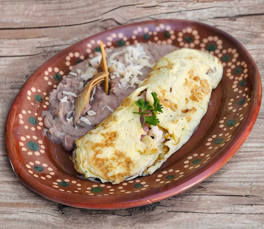 Relleno de jamón, champiñones o rajas, acompañados de frijoles refritos.