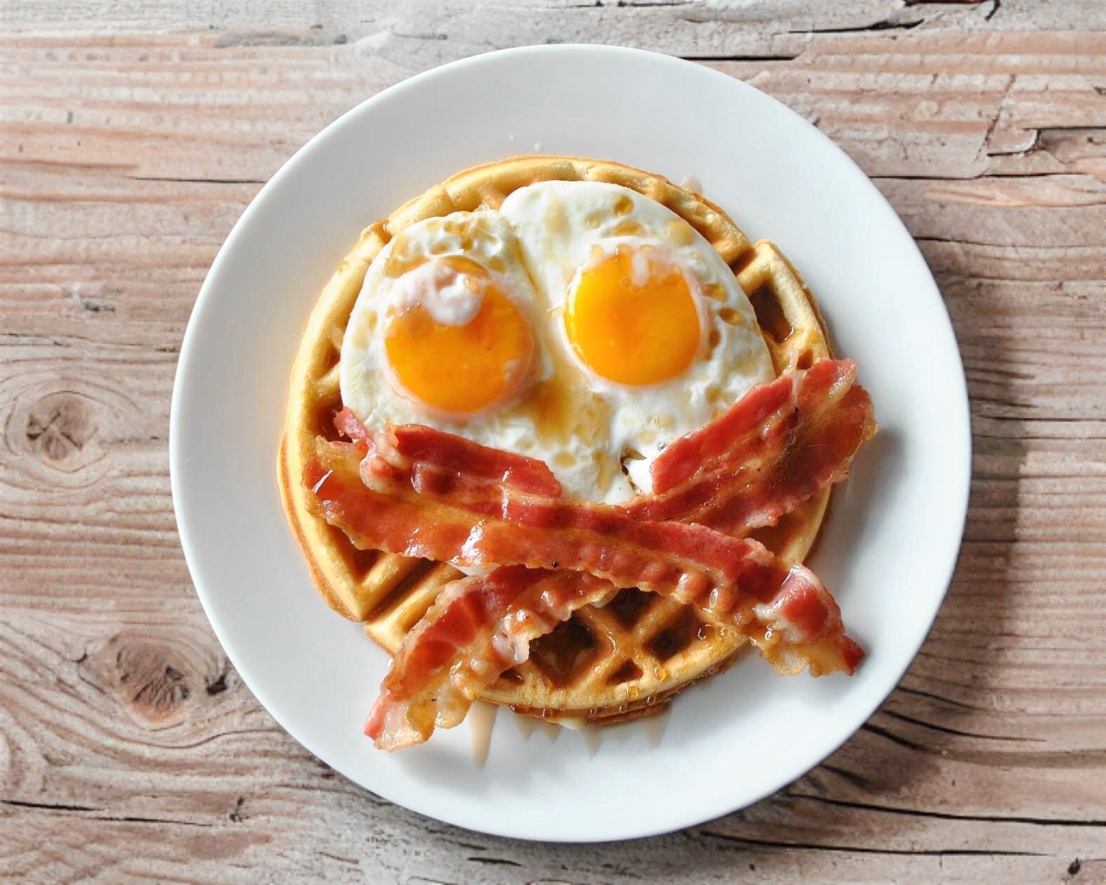 Dos huevos estrellados, tocino y miel de maple.