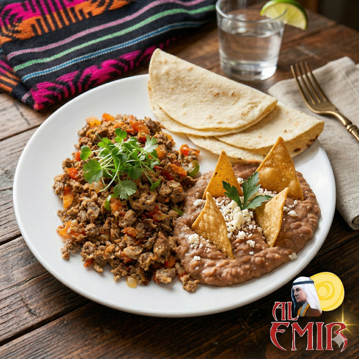 Con Jamón / Tocino / o Chorizo Frijoles refritos con totopos y tortillas de maíz.