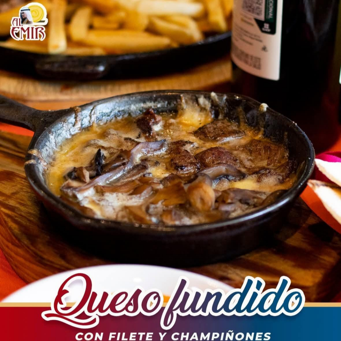 QUESO FUNDIDO CON FILETE Y CHAMPIÑONES