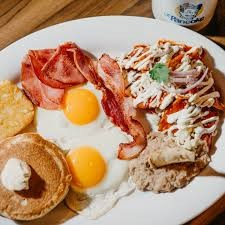 2 huevos estrellados, 3 hotcakes chicos , Frijoles refritos y tocino.