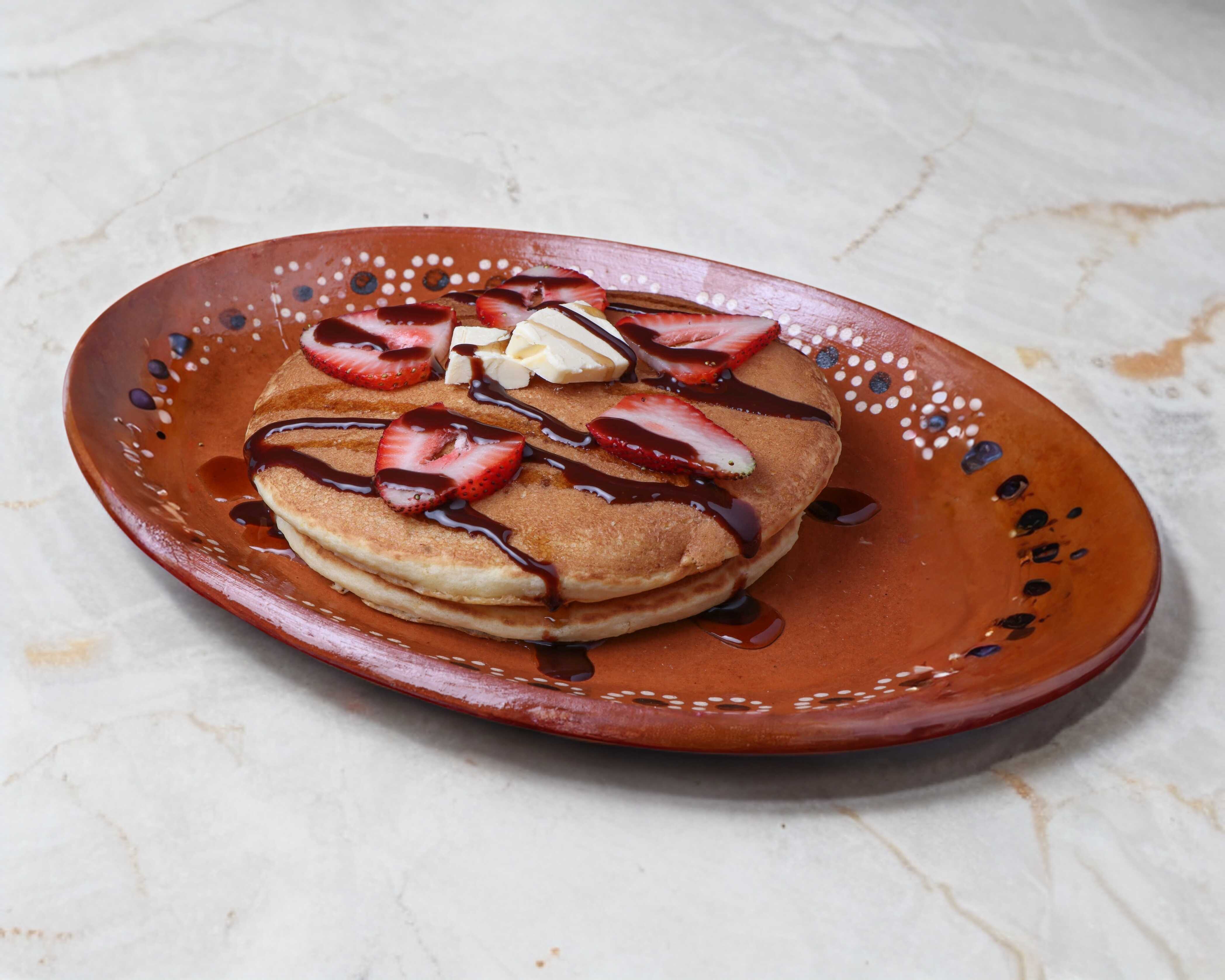 2 Hot cakes con fruta de tu eleccion acompañados de mantequilla, miel o mermelada