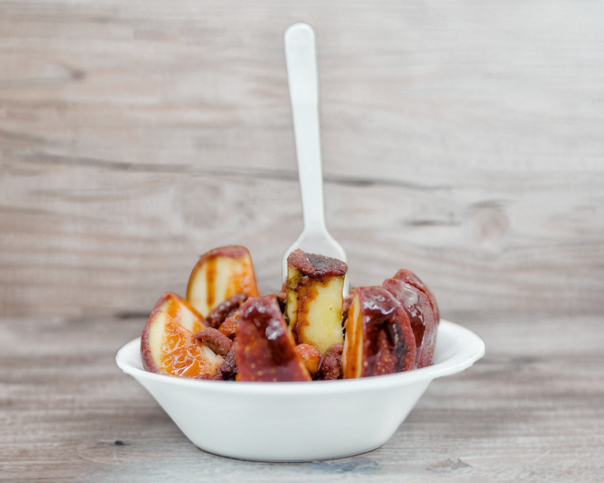 Deliciosa manzana desgajada cubierta de tamarindo acompañada de cacahuate japones, rielito, chamoy dulce, salsas y limón.
