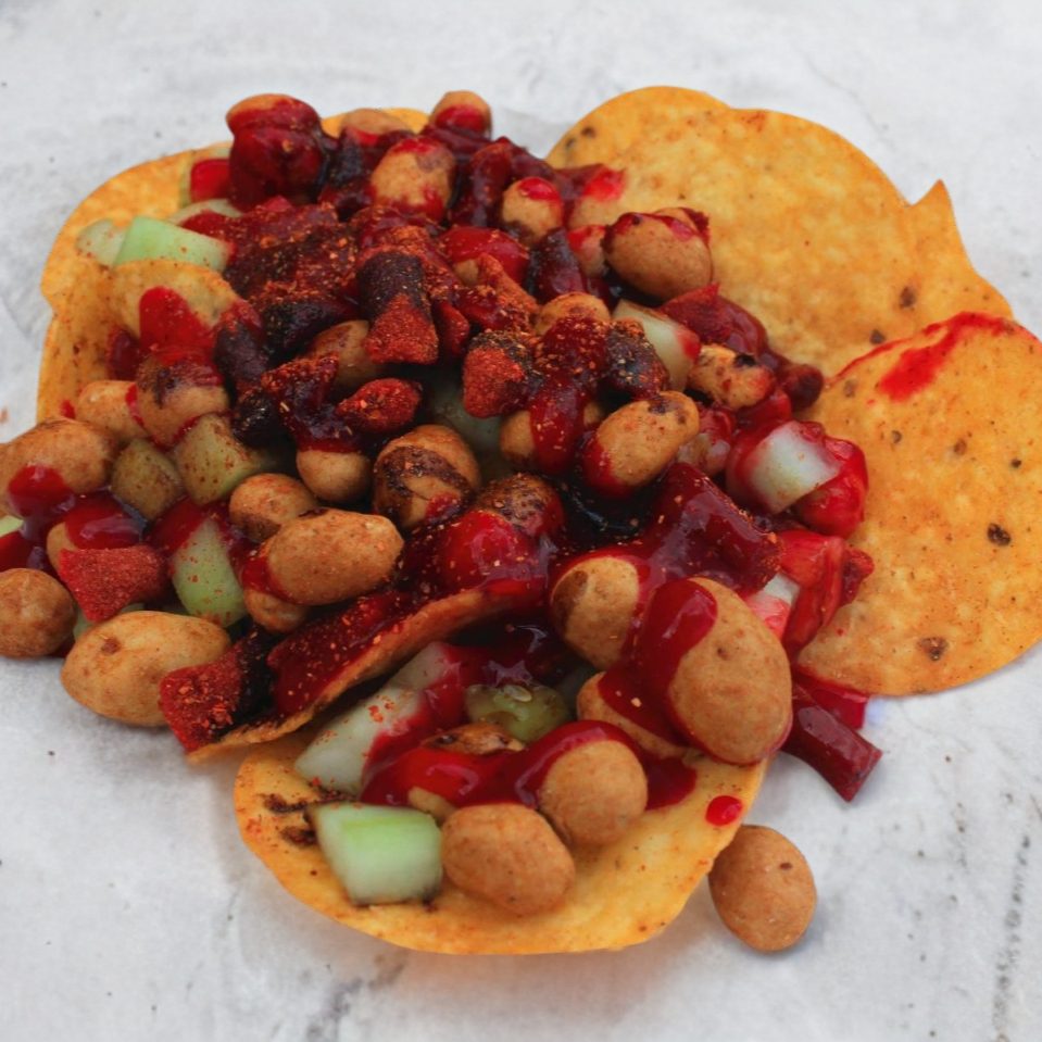 La combinación perfecta; Cacahuate japonés, pepino, rielito, clamato, chamoy, salsa maggi, limón y chile en polvo.