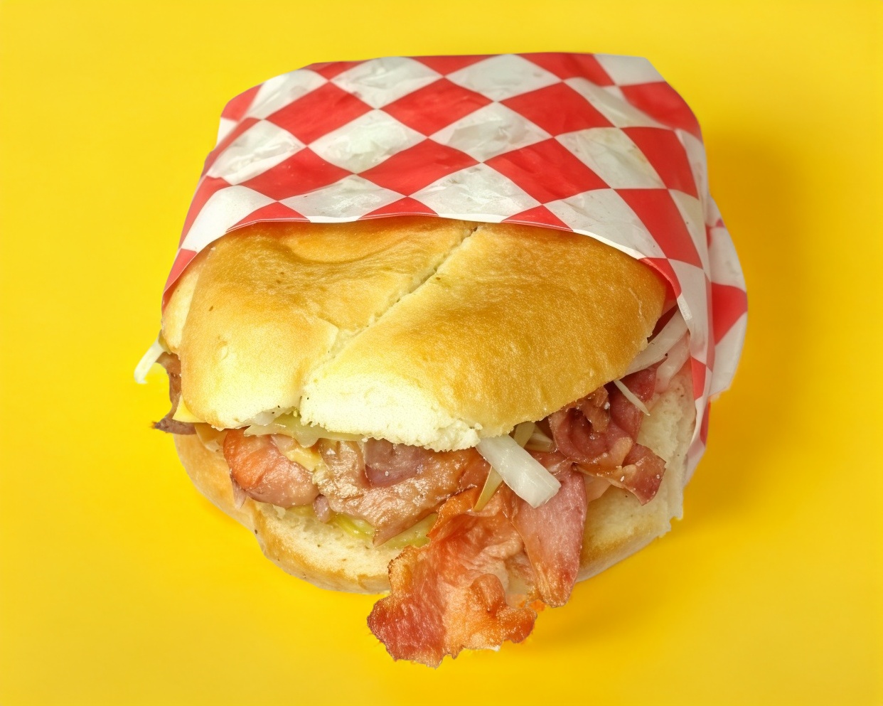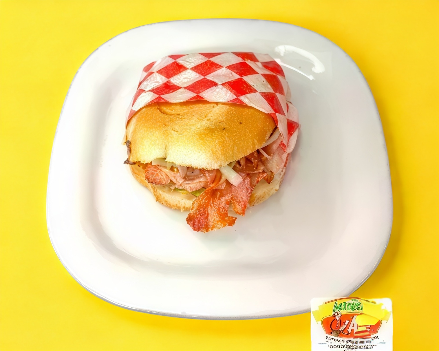 Carne, jamón, queso amarillo, aderezo y verduras.