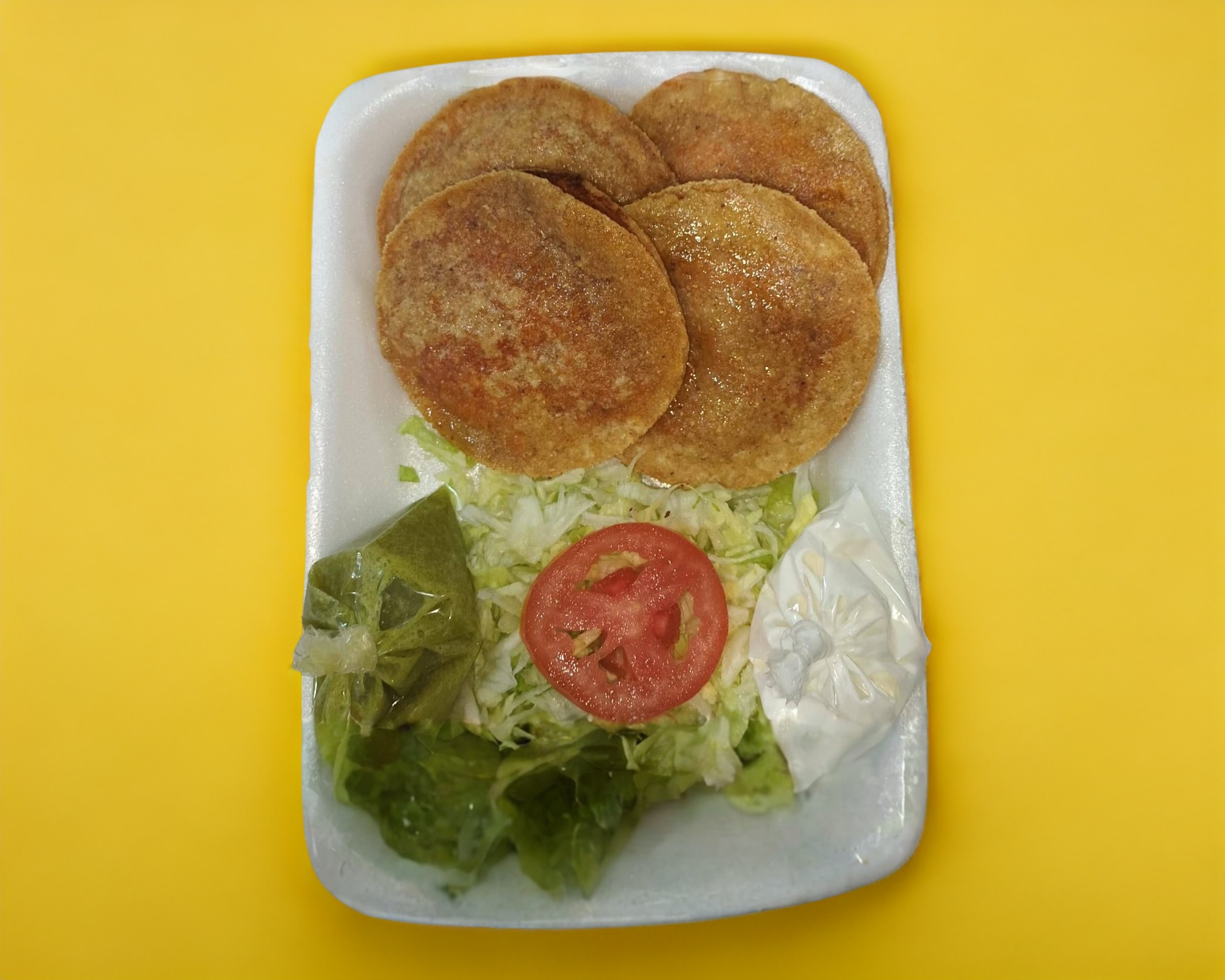 Gorditas Doradas ( 4 piezas) con lechuga, crema, tomate, crema, salsa verde y limón.