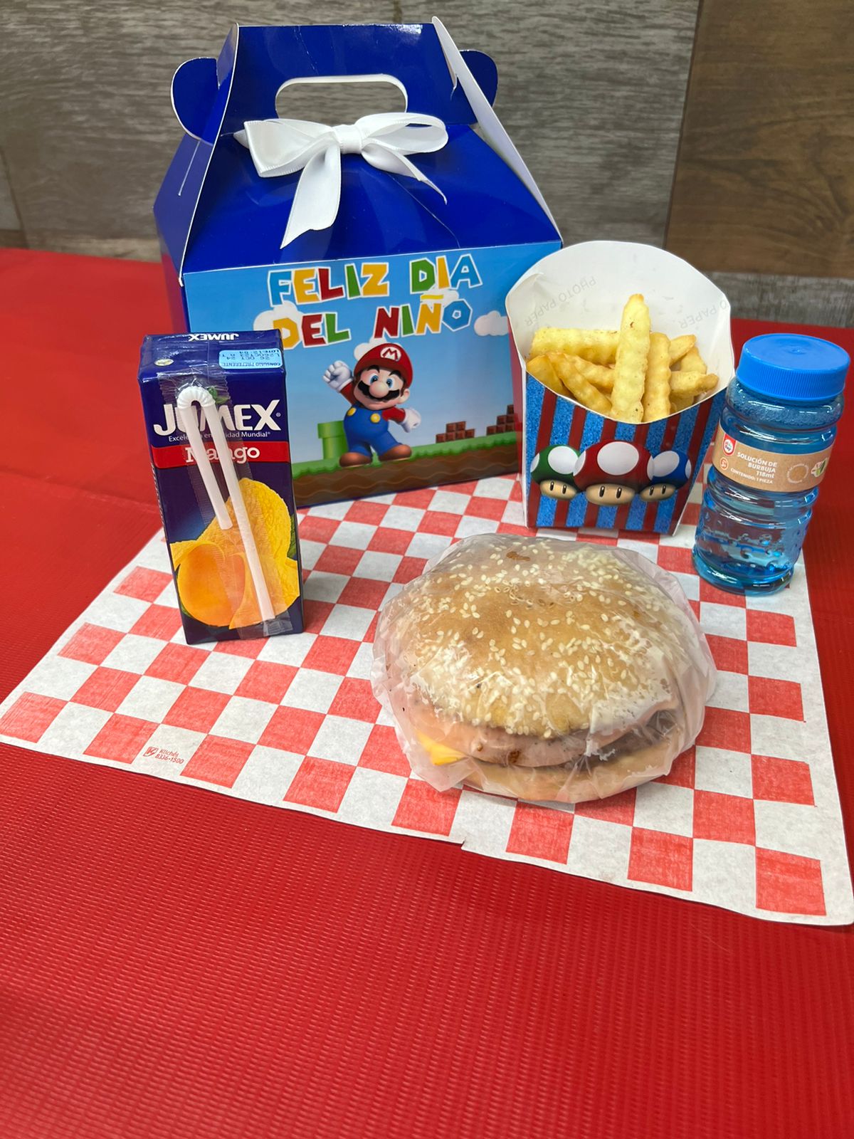 1 Mini Hamburguesa + Papas Fritas + Jugo Cajita + Un Juguete