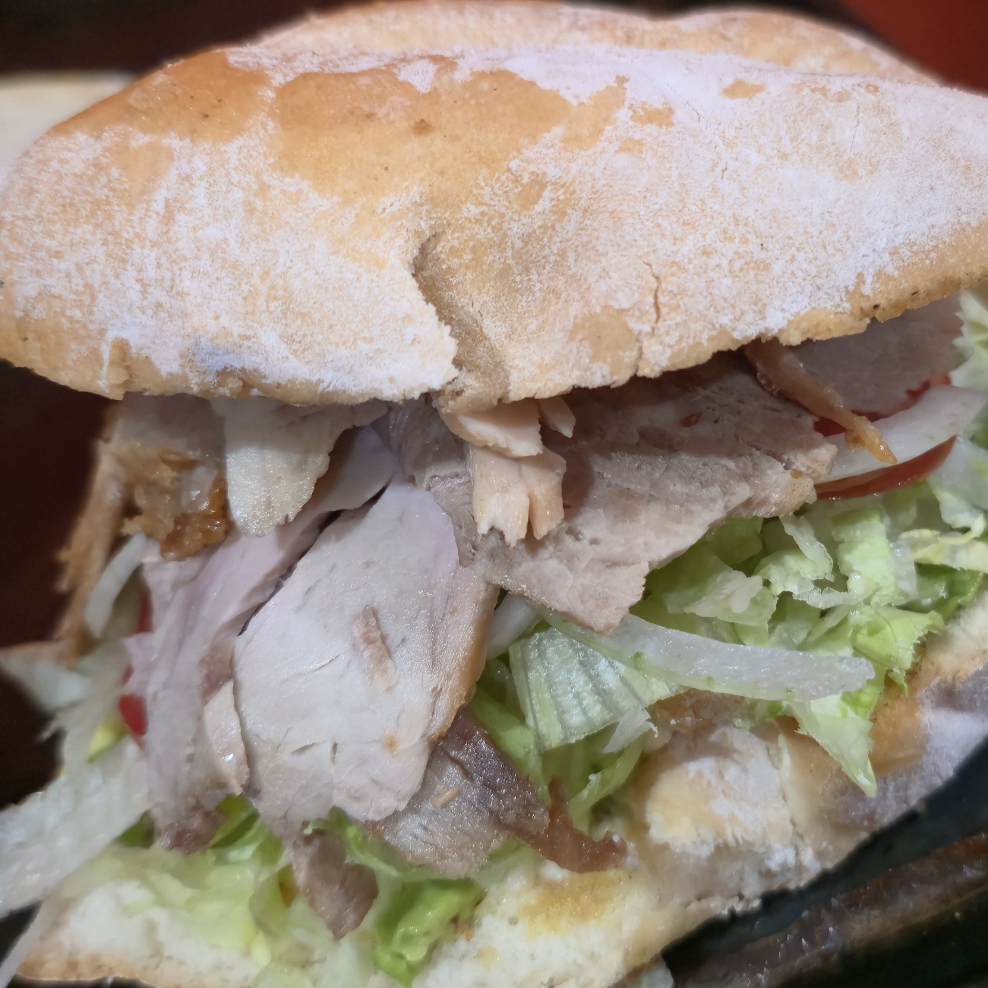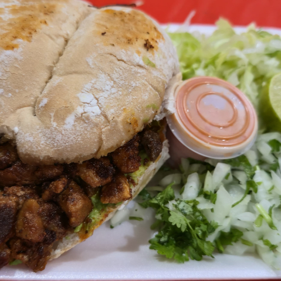 Telera con carne adobada, jamòn, queso blanco, queso amarillo, aguacate, mayonesa, mostaza, lechuga, cebolla y salsa roja.
