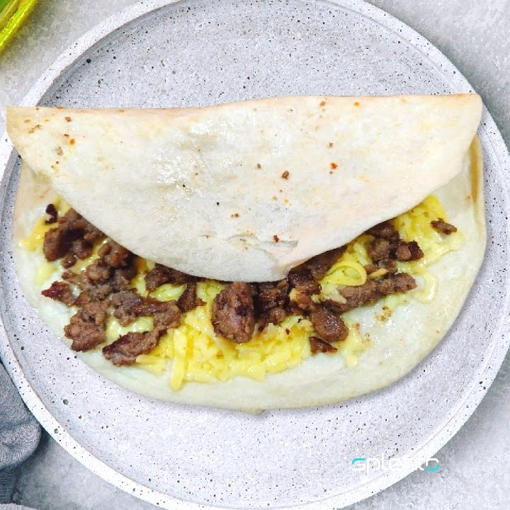 Tortilla de harina, con queso y carne adobada.