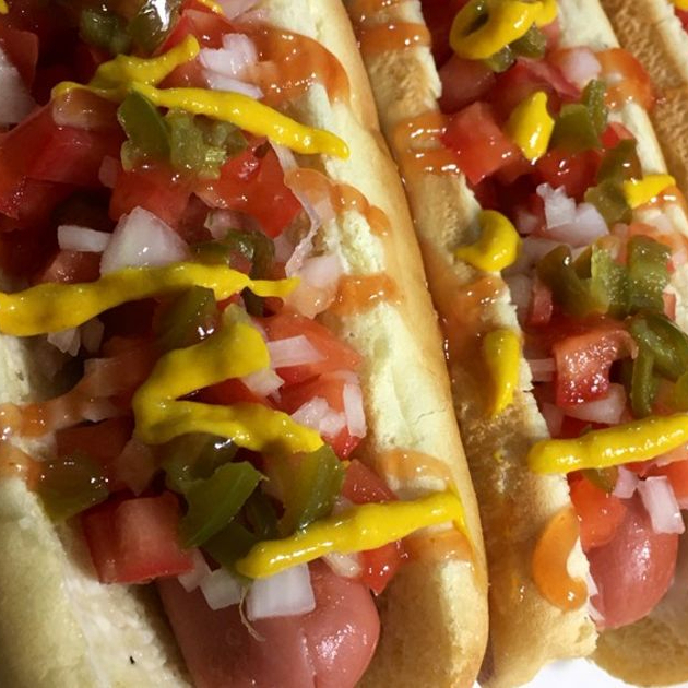 pan con salchicha frita, tocino; aderezos catsup, mayonesa y moztaza. Y chiles en escabeche.