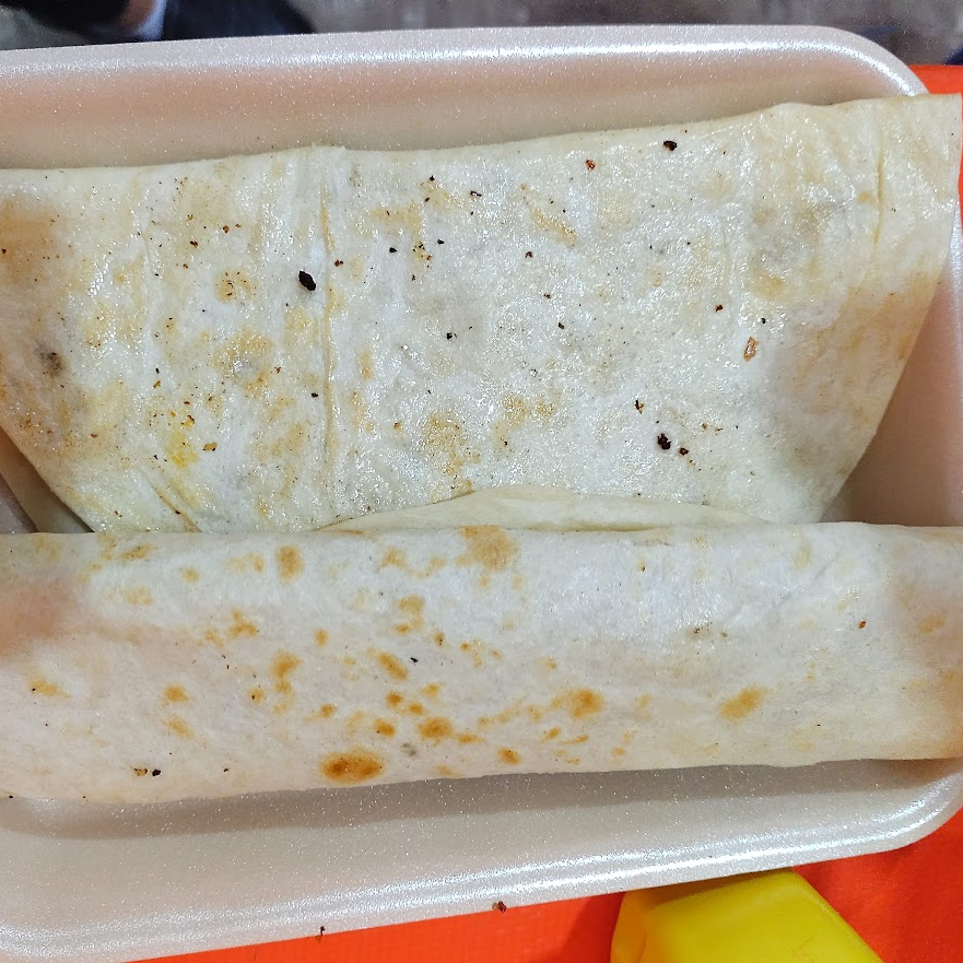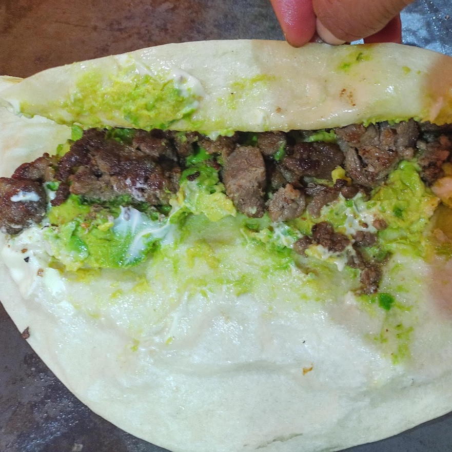 Es tortilla de harina con aguacate, mayonesa y carne asada. Como complementos lleva cebolla con cilantro, lechuga, limon y salsa roja.
