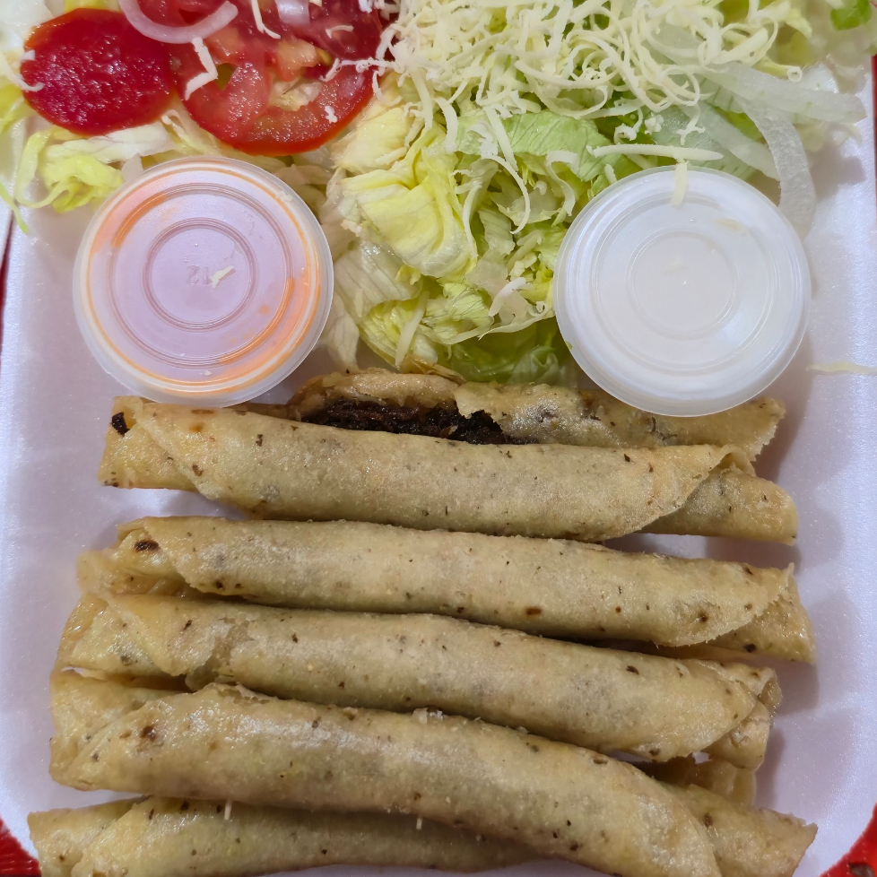 8 tacos dorados de carne deshebrada, con lechuga, cebolla, tomate, limòn, crema y salsa roja.