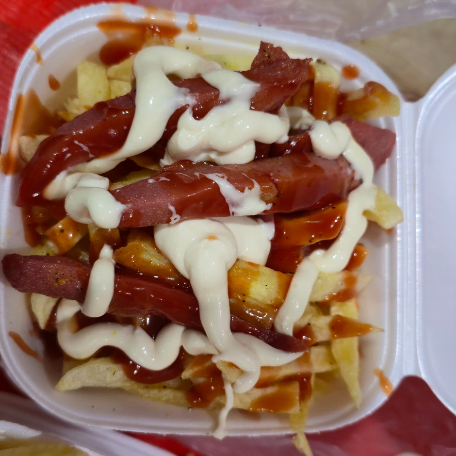Son papas naturales, acompañadas de salchichas, catsup y mayonesa.