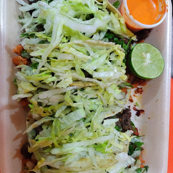 Son 5 tacos tortilla doble con carne asada y como complementos lleva cebolla con cilantro, lechuga, limon y salsa roja.