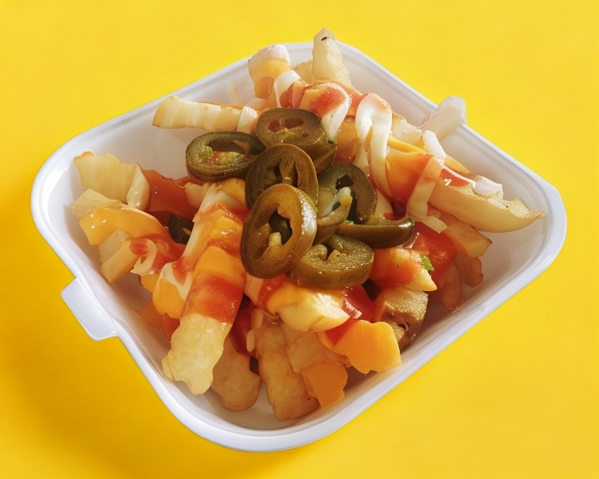 Papas fritas, queso amarillo, mayonesa, cátsup y chile.