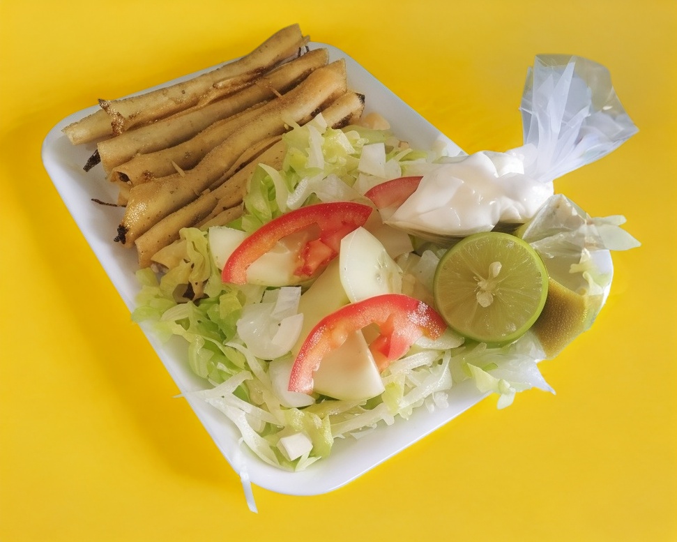8 Tacos de deshebrada, lechuga, tomate,cueritos, salsa y crema.