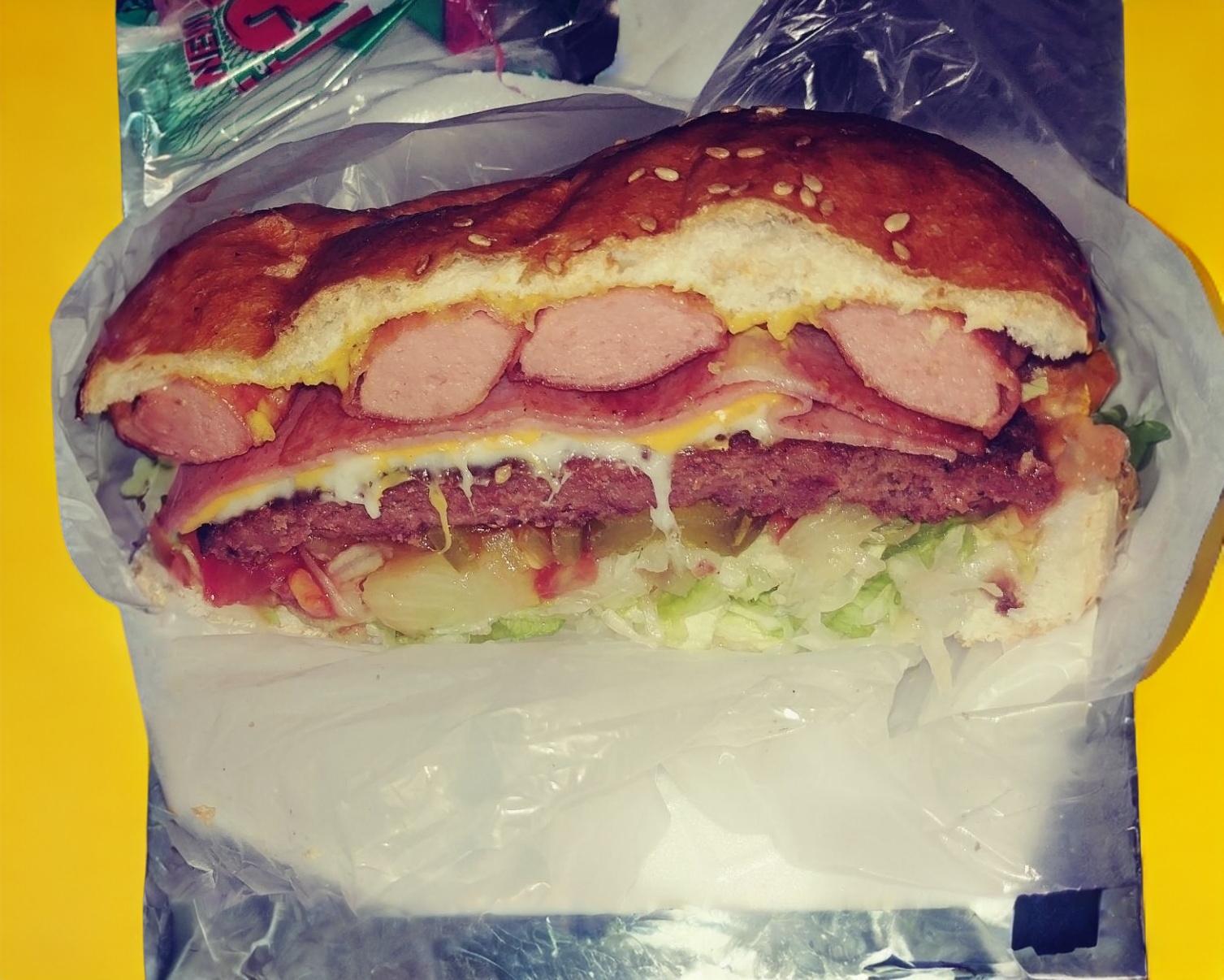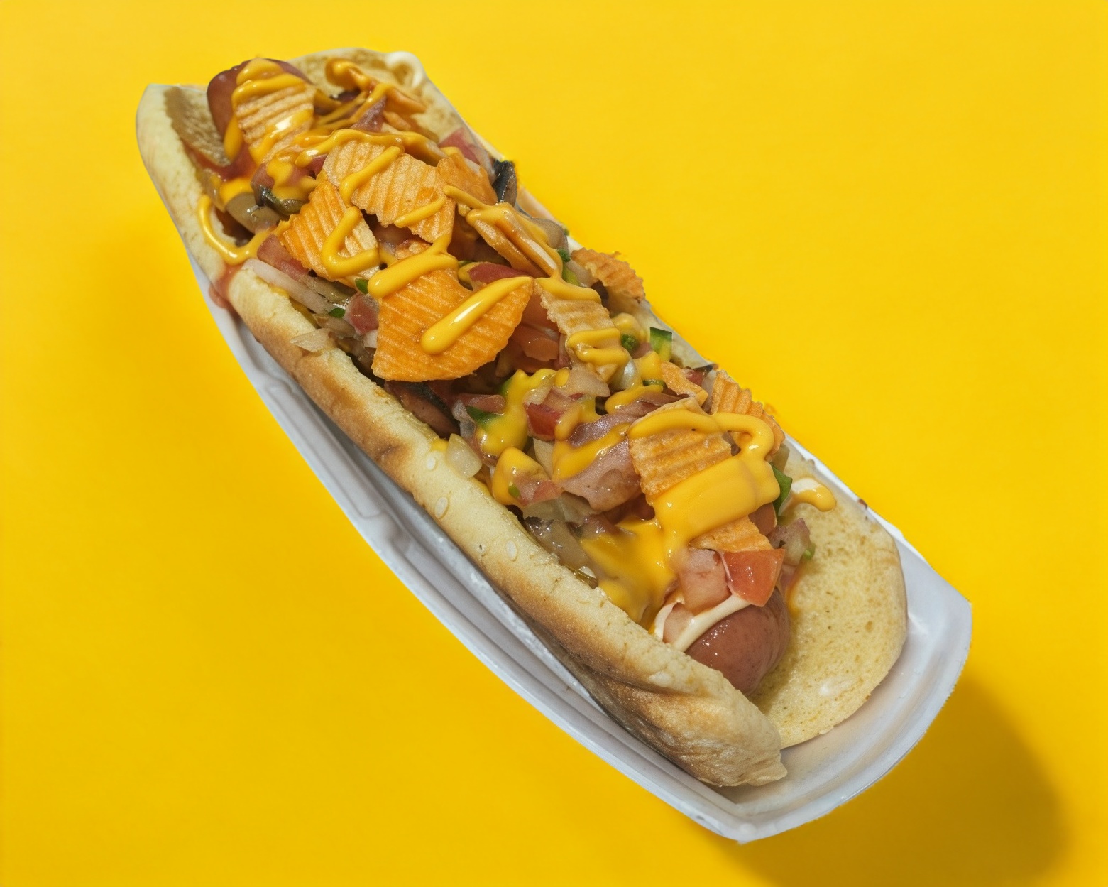 Mostaza, mayonesa, cátsup, queso amarillo, tocino, champiñones, Ruffles.