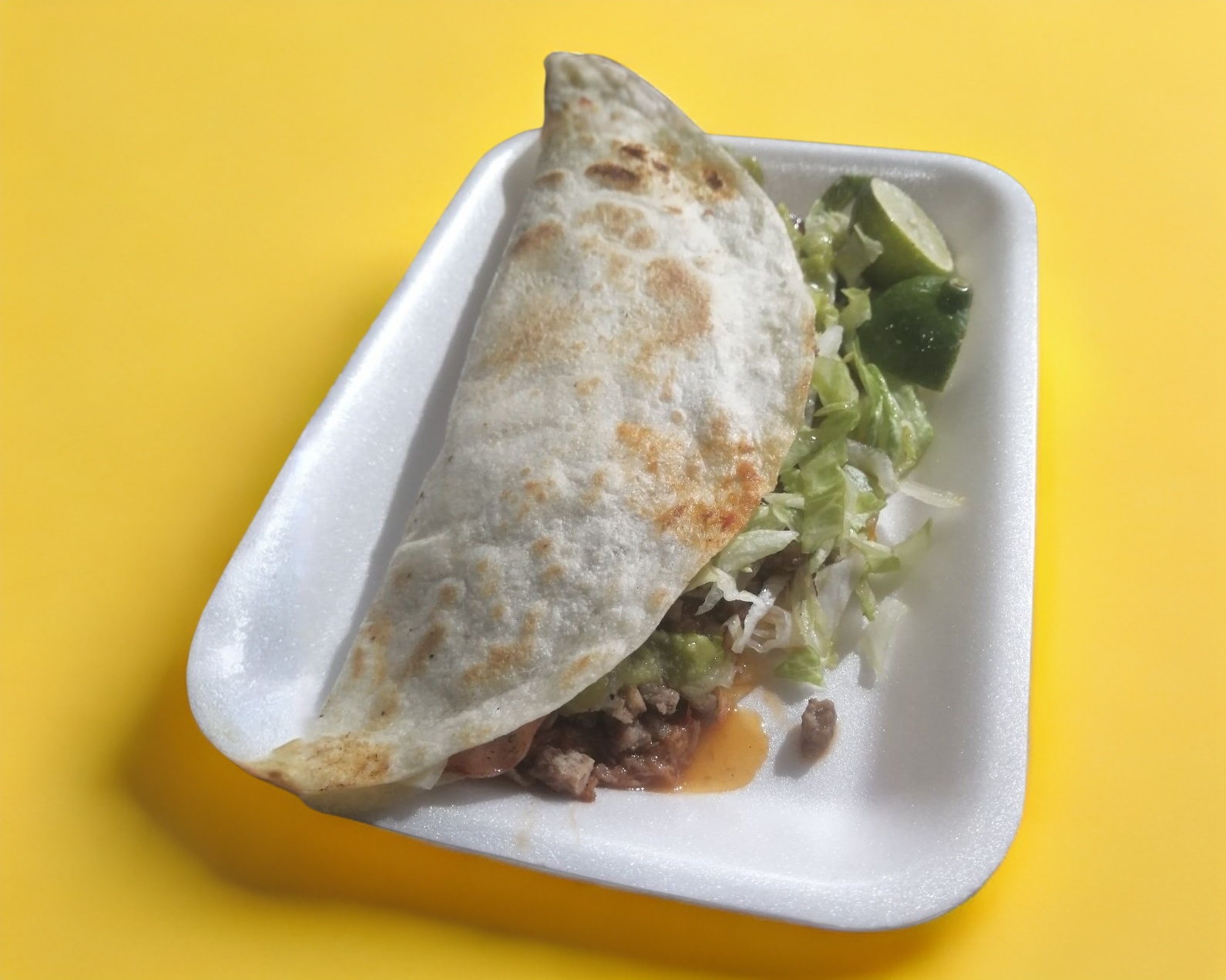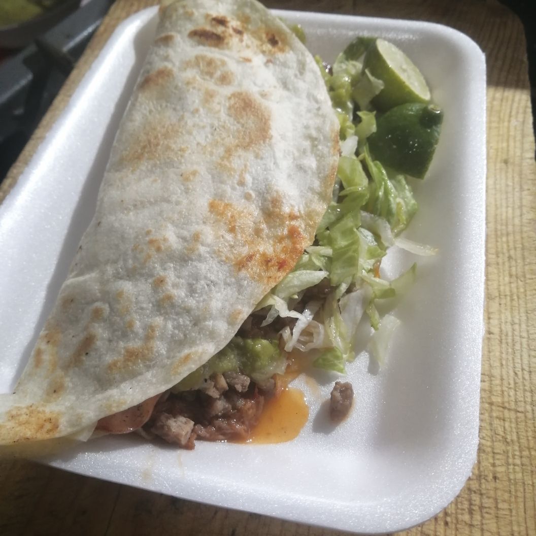 Tortilla de harina, queso, deshebrada, tocino, lechuga, cebollas asadas, salsa de aguacate.