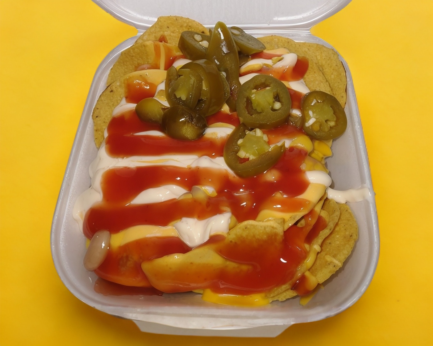 Totopos, frijoles, aderezo amarillo, mayonesa, cátsup, chile y carne asada.