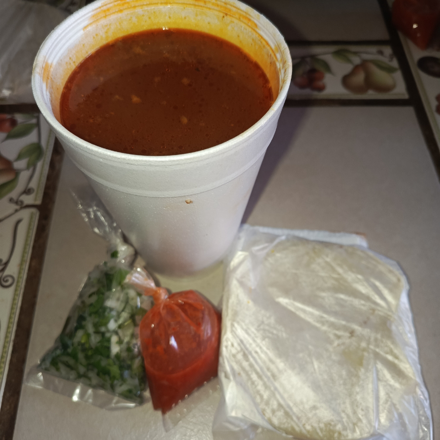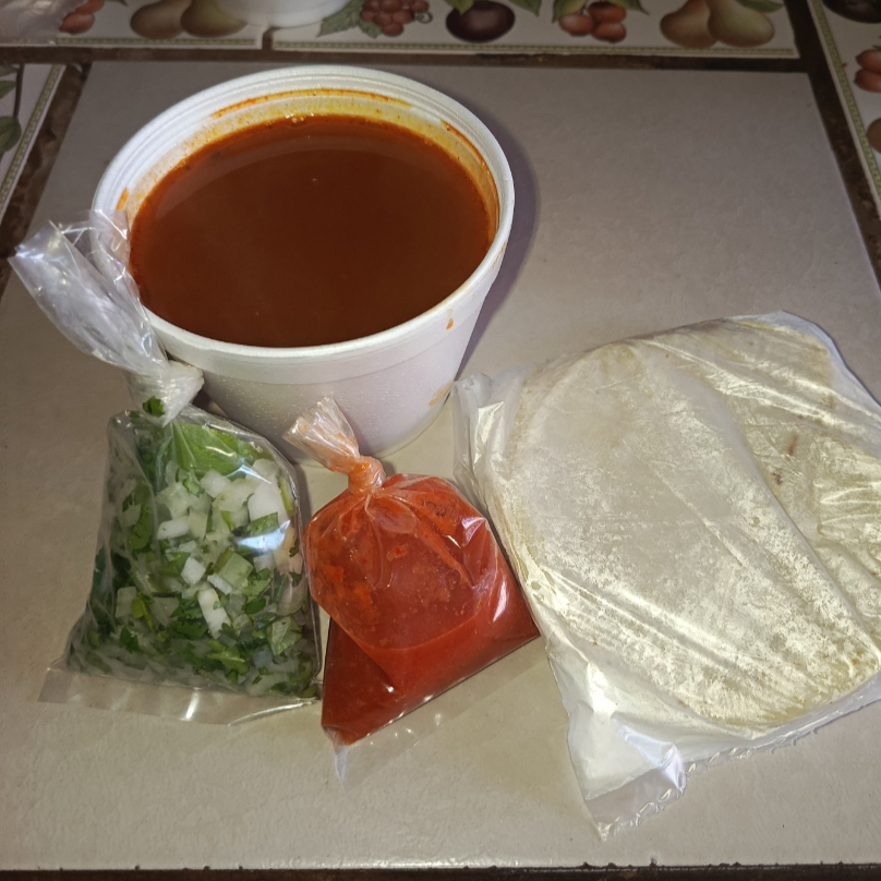 300g de carne su respectivo caldo, tortillas, cebollita, salsa y limones.