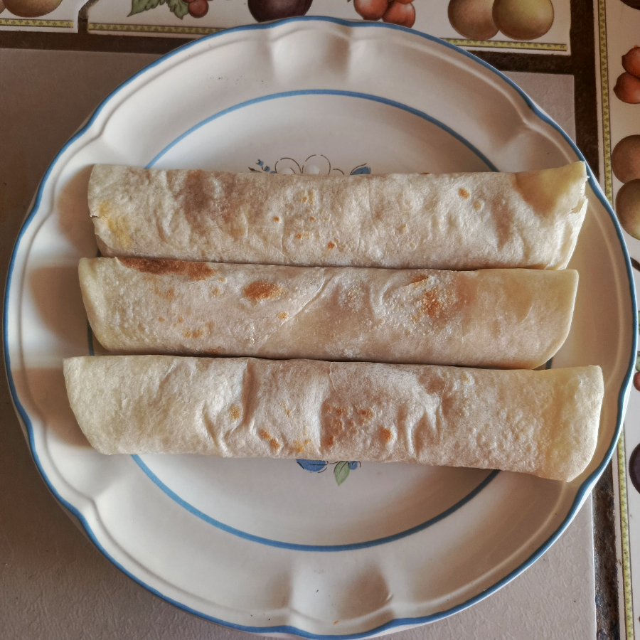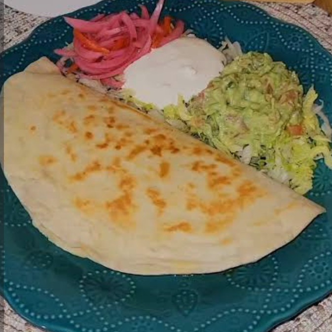 Tortilla de harina con guiso de rajas, queso, lechuga, salsa, crema