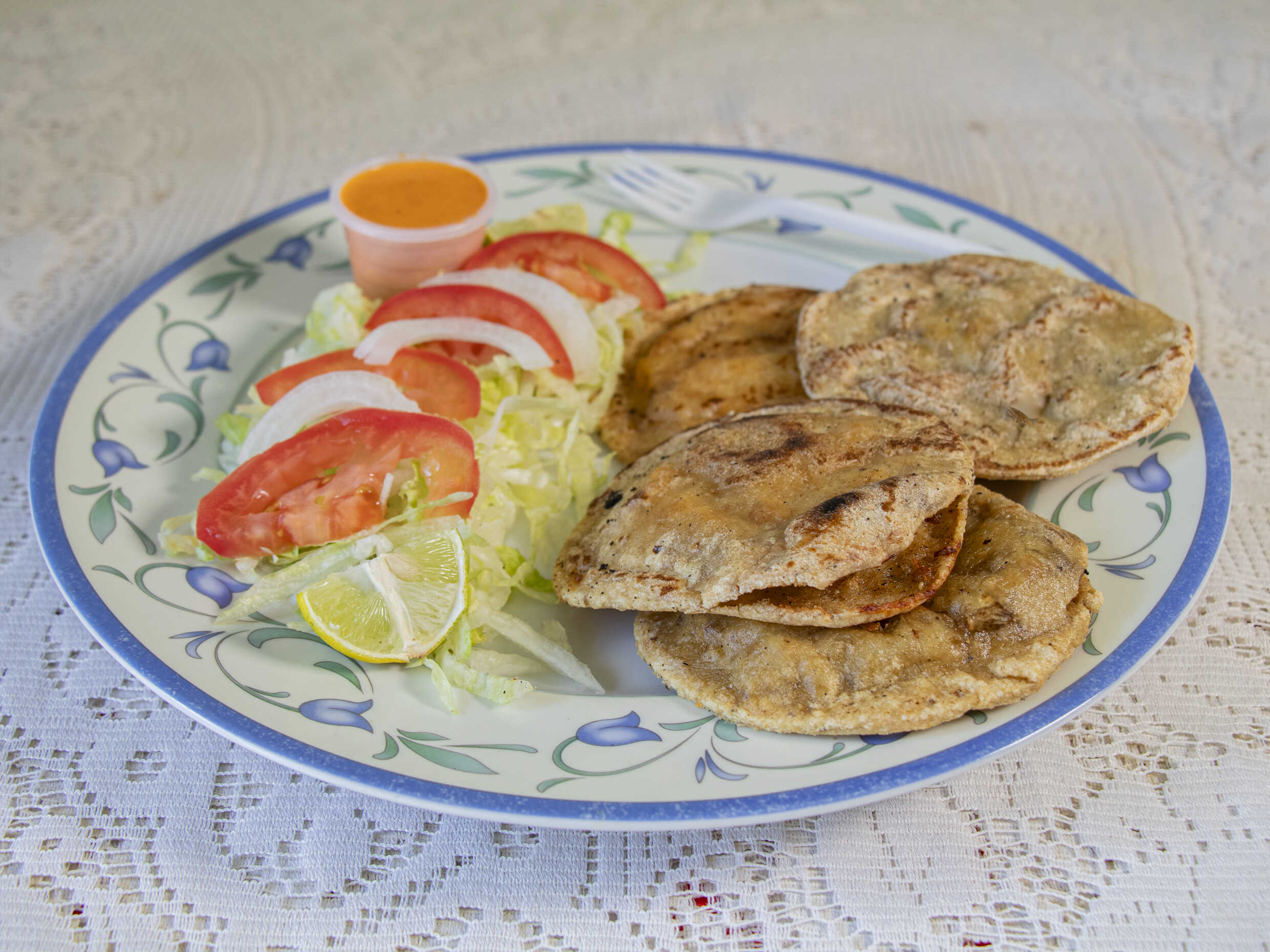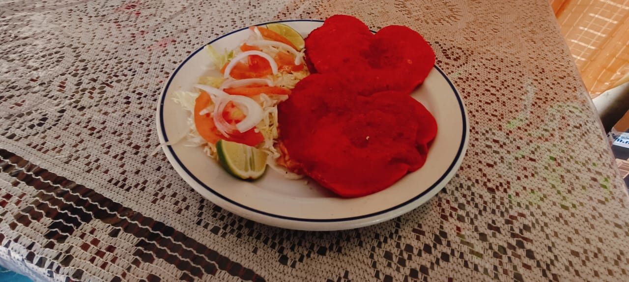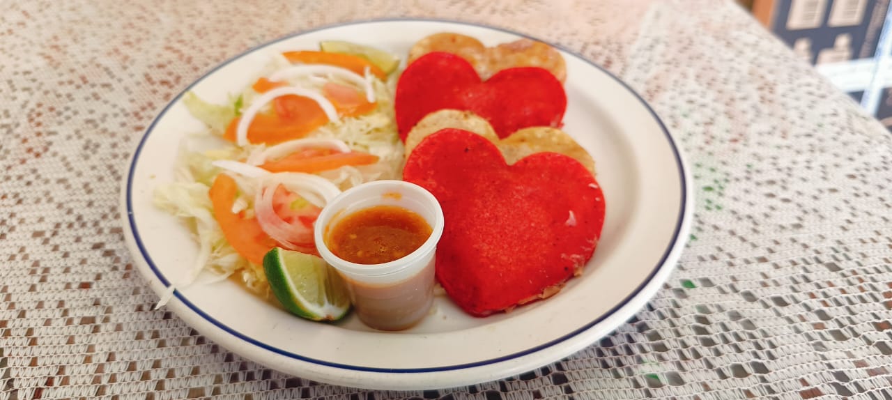 Orden de 4 gorditas doradas surtidas con verdura y salsa en forma de Corazón