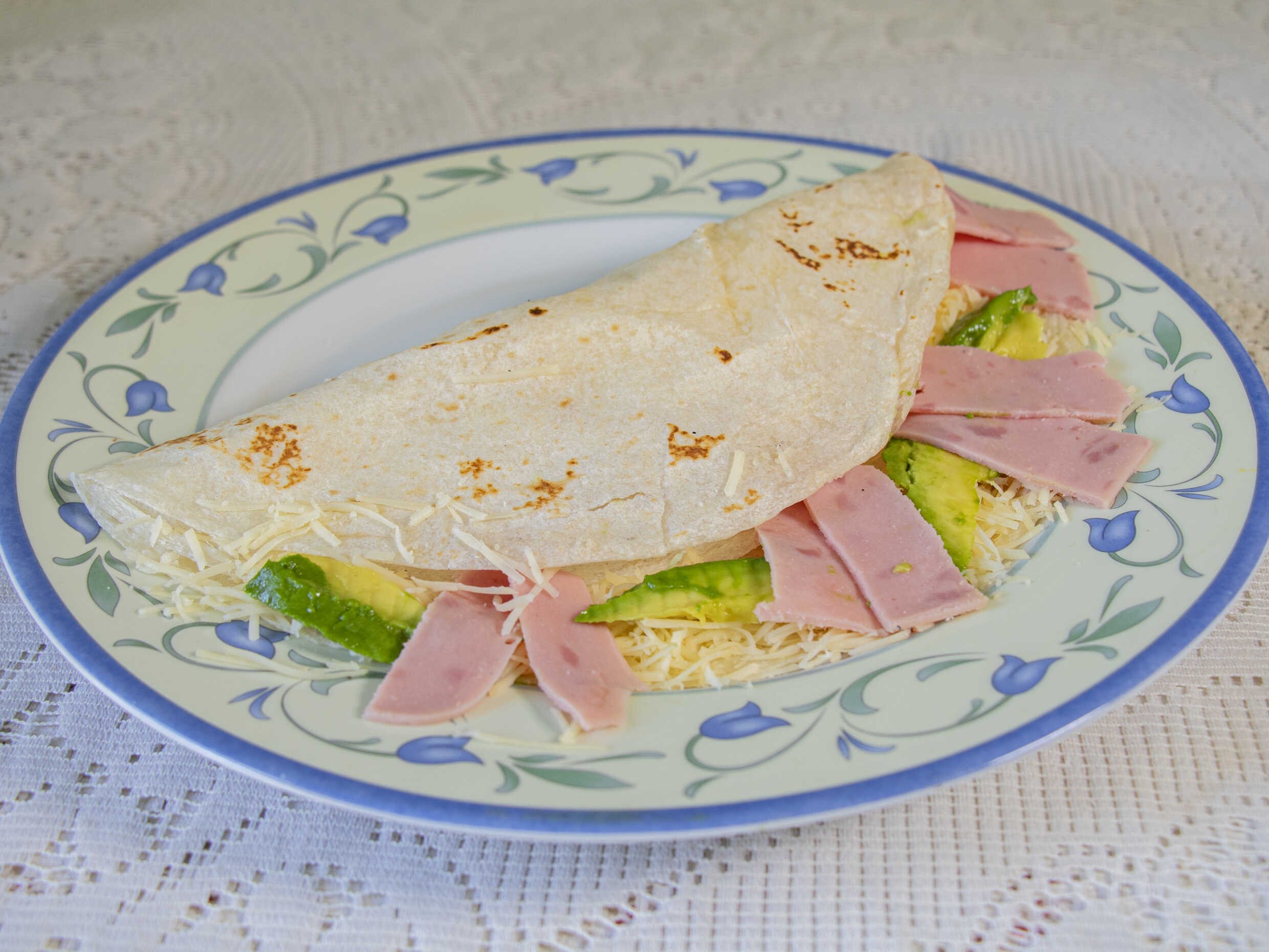 Sincronizada de harina con jamón, aguacate, mayonesa, chile y queso.