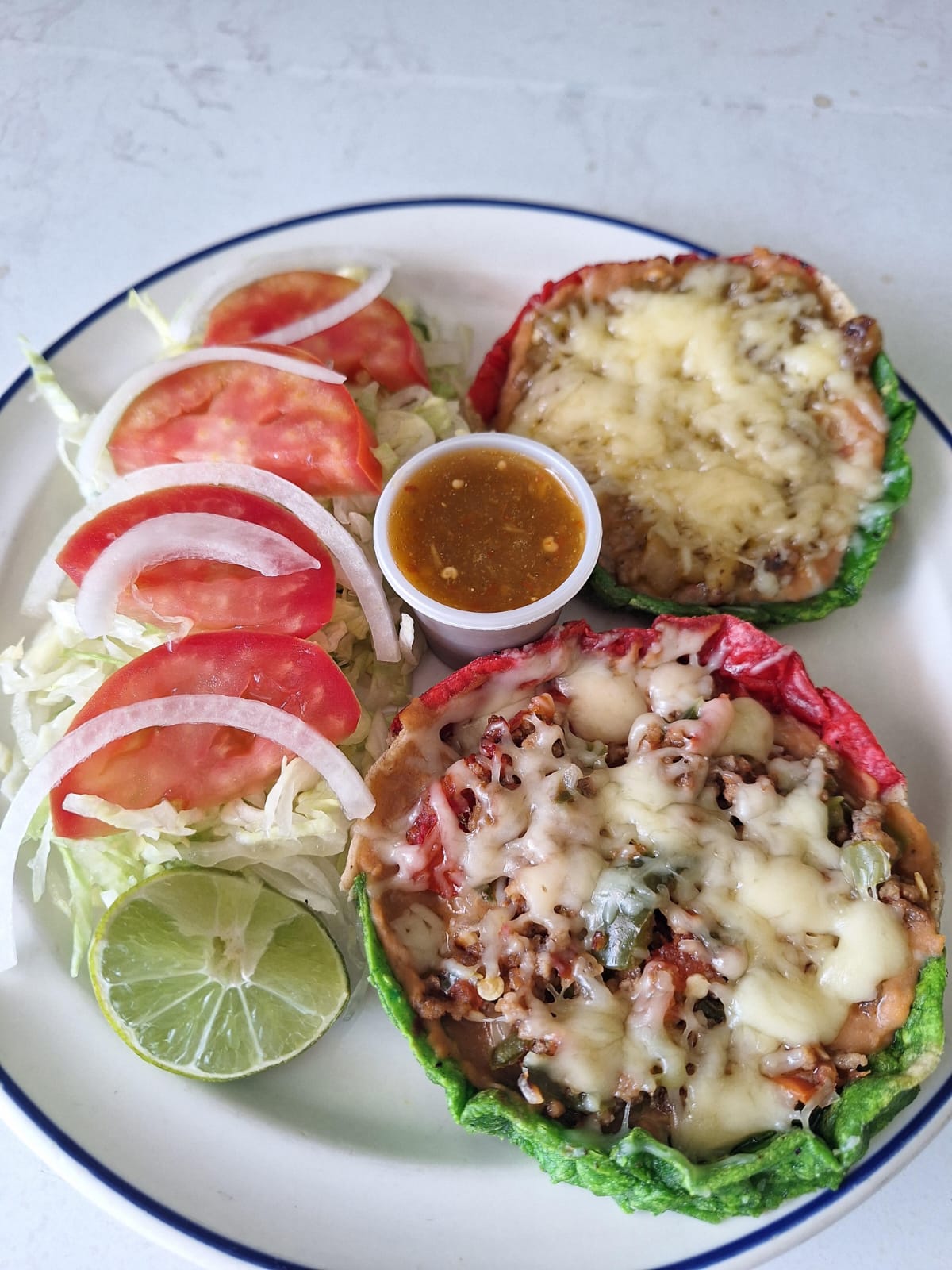 Sope con frijoles, guiso a elección y queso gratinado acompañado de su verdura y salsa.