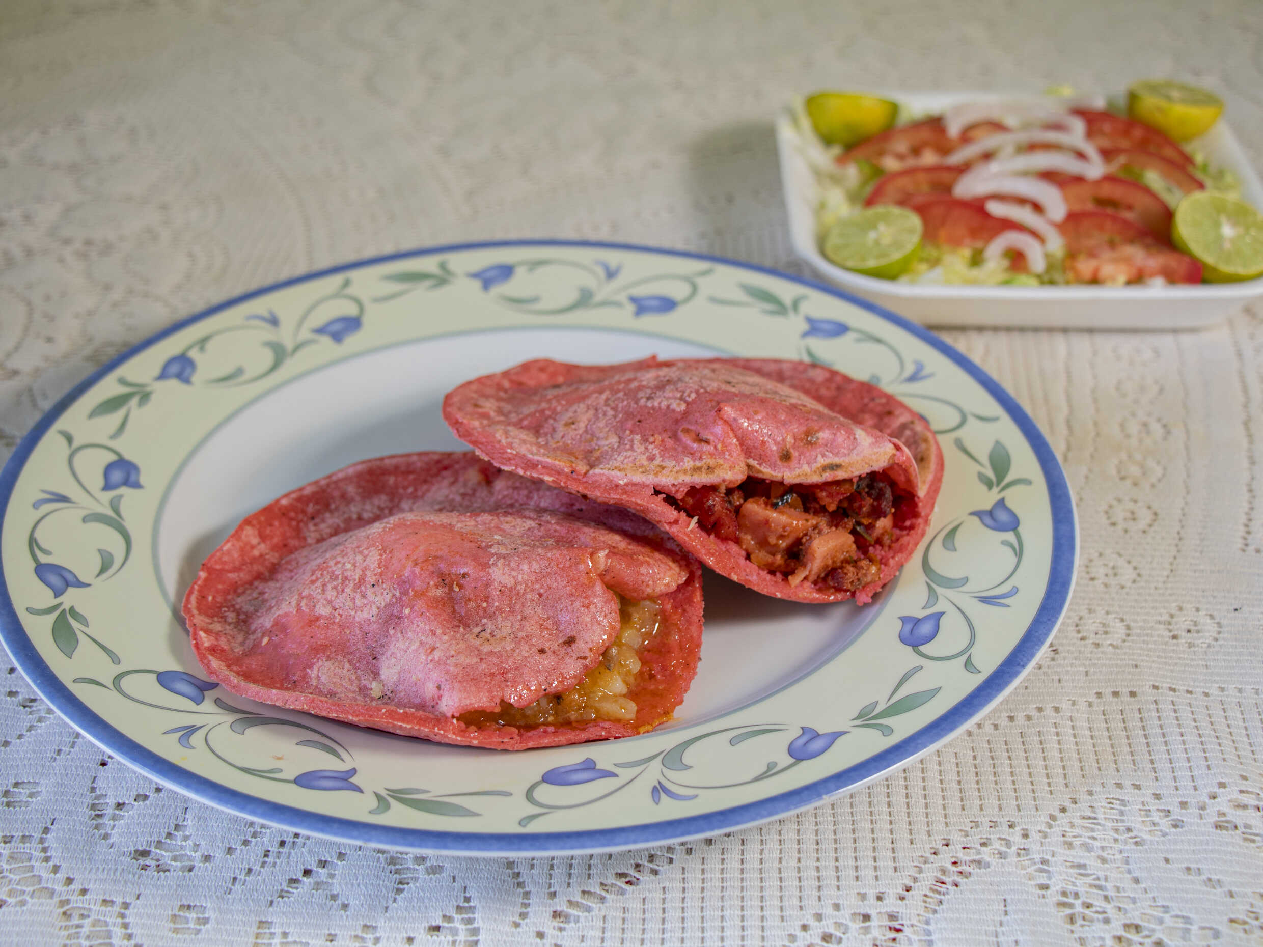 Gordita de maíz rellena del guiso a elección con forma de corazón y con el color característico de Barbie