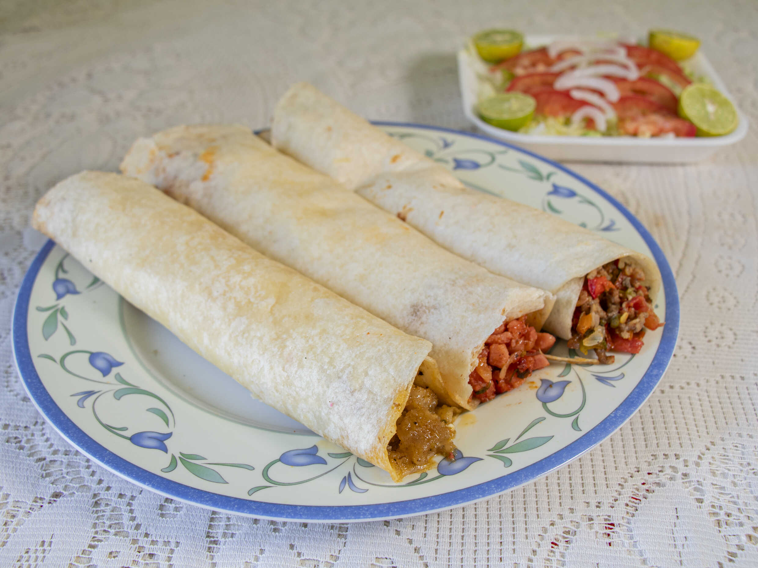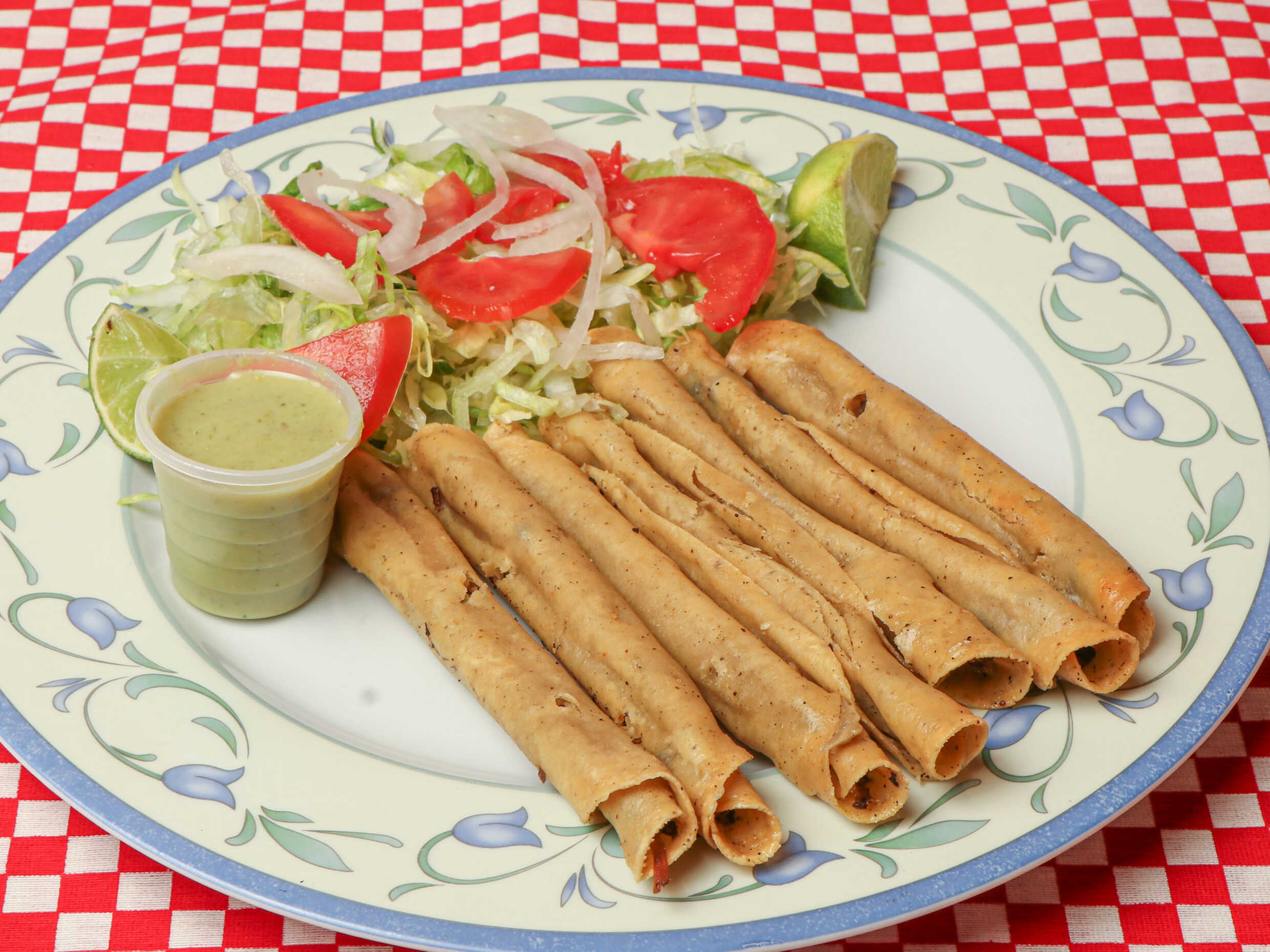 Orden con 7 taquitos dorados de papa, frijoles, rajas y deshebrada acompañados de verdura y salsa