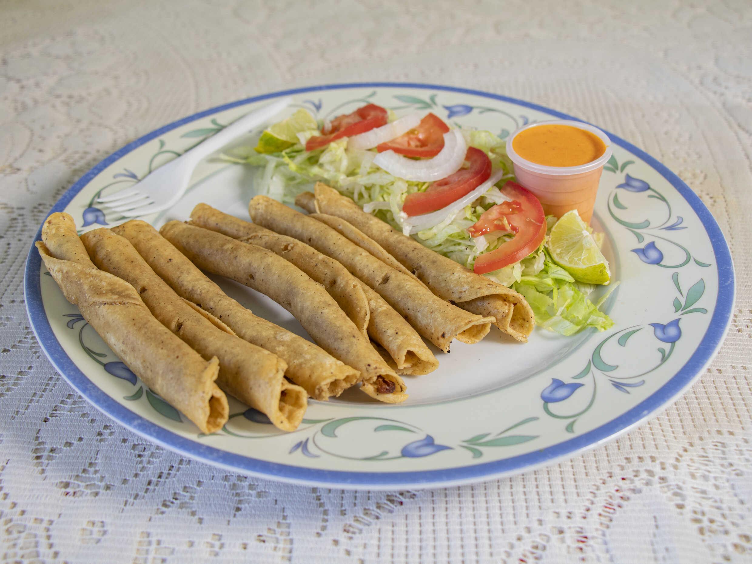 Orden de 7 taquitos dorados de deshebrada acompañados de su verdura y salsa.