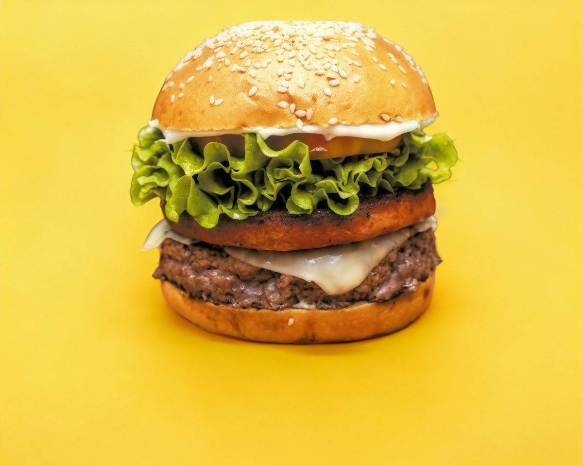 Hamburguesa acompañada de verduras, aderezos, queso y jamon