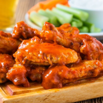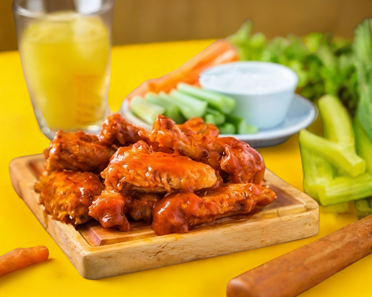 Deliciosas alitas bañadas en salsa bufalo acompañadas de bastones de zanahoria, apio y aderezo ranch