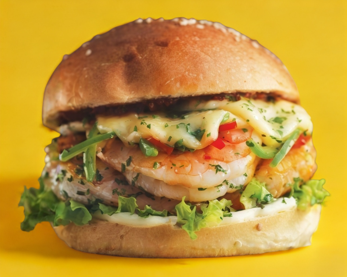 Hamburguesa de camaron cocido acompañada de verduras, piña, jamon, queso y aderezos