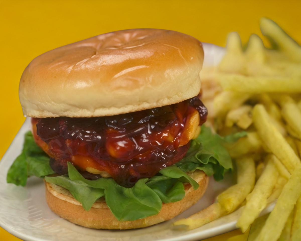 Hamburguesa bañada en salsa bbq con verduras queso, jamon, tocino, piña, tocino, y jalapeños
