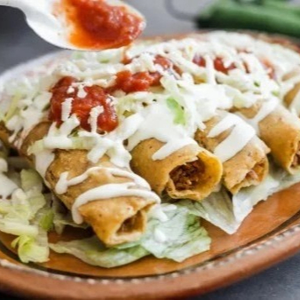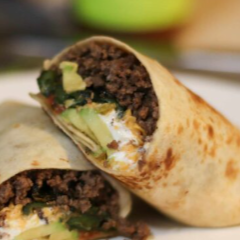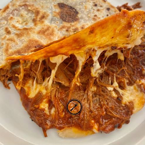 Tortilla de harina , queso, tocino,jamón, carne deshebrada, Lechuga, tómate, cebolla y chile toreado