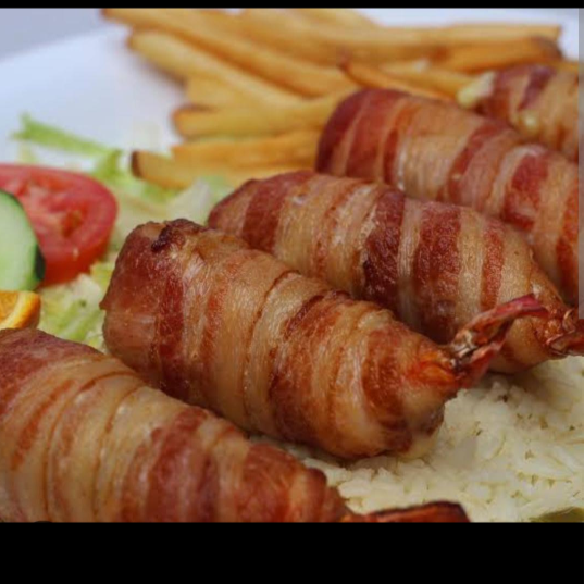 Camarones rellenos de queso envueltos en tocino ,acompañados de ensalada y papas a la francesa