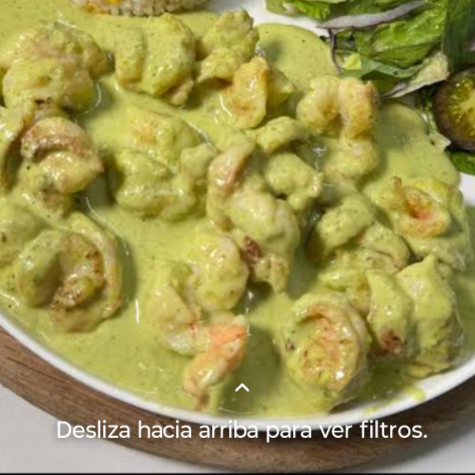 Camarones bañados en salsa de chile poblano tatemada acompañados de papas fritas y ensalada