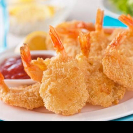 Camarones empanizados acompañados de papas fritas y ensalada de lechuga